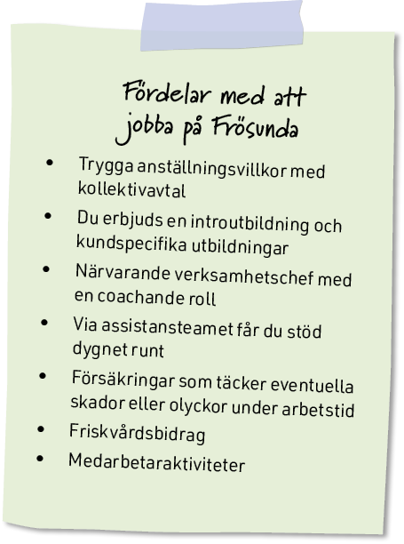 Frösunda är en av landets ledande assistansanordnare med erfarenhet sedan år 1994. Det gör oss till en trygg arbetsgivare för dig som medarbetare. Vi är också ett familjeföretag med en teamkänsla som gör att människor känner sig sedda och hörda. Vår drivkraft är att skapa livskvalitet för alla som står oss nära – kunder, närstående och assistenter. Som personlig assistent blir du en avgörande pusselbit i vårt arbete att göra skillnad för människor – på riktigt.